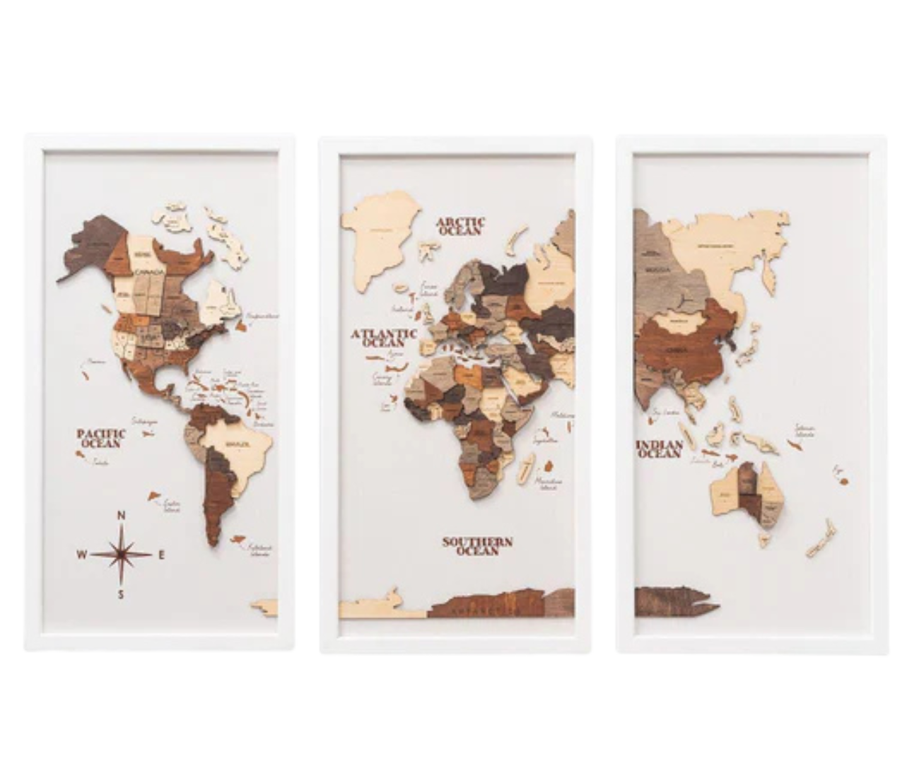 Die dreiteilige Weltkarte überzeugt durch ihre detailreiche Darstellung und die lebendigen Farben, die die Vielfalt und Schönheit unserer Erde widerspiegeln. Von den tiefblauen Ozeanen bis zu den konturgenau gravierten Ländergrenzen – jedes Element der Karte ist sorgfältig gestaltet, um nicht nur ästhetisch ansprechend zu sein, sondern auch informativ und inspirierend.