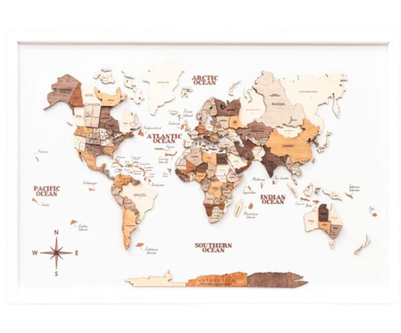 Bitte beachte, dass es sich bei dieser Karte nicht um eine geografische Darstellung handelt, weshalb einige kleinere Länder und Inseln weggelassen sein können. Jede Karte ist einzigartig und die Farbtöne variieren, da sie aus natürlichem Holz gefertigt wird.